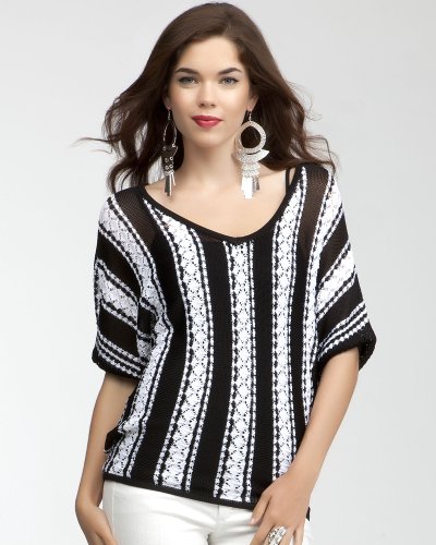 Work a strong print into you casual go-tos. This bebe sweater features a relaxed fit with a semi-sheer drape and cool mixed stitching detail. Cami not included. Try it with a pair of black leggings and metallic pumps. Center back to hem: 25"/64 cm.