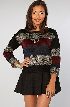 Motel The Holla Striped Sweater in Black, Red and Royal Mixed Yarn,Sweaters for Women. Model is wearing a size SmallCrewneck drop-shoulder sweater; 100% acrylic.By Motel