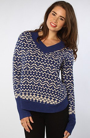 Funktional The Tucker Patterned Crewneck Sweater in Blue and Cream. Model is wearing a size Extra SmallV-neck knit sweater with allover print; tonal ribbing at neck, bottom paneling and cuffs; 30% wool, 40% acrylic, 20% nylon, 10% viscose.By Funktional